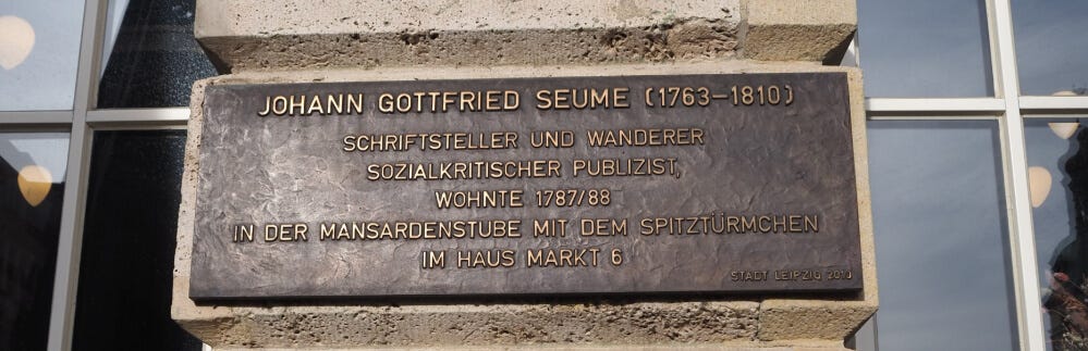 In November, while spending a few days in Berlin1, I took the opportunity for a day trip to Leipzig, the city in which Seume spent half his life. In his Leipzig, one building helped shape him and another gave him shelter.